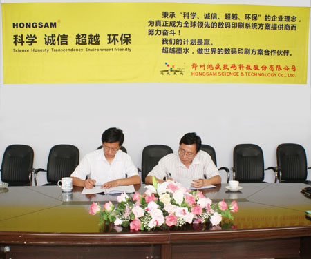 双方代表:河南创业投资股份有限公司董事长赵志勇(右一)与郑州鸿盛数码科股份有限公司董事长秦国胜(左一)在合作协议上签字。
