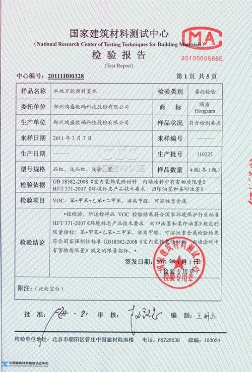 1、采用鸿盛拥有专利技术的“水性*能颜料墨水”,该水墨符合装饰材料领域的环保性、色彩表现、色牢度等方面性能指标。鸿盛(hongsam)4008810850水性*能颜料墨水的面世方使得装饰材料的数码印花成为现实。可以说这款产品的横空出世直接抢占了当下大面积使用的弱溶剂墨水的空间,是弱溶剂产品的终结者。在全球日益提倡低碳环保大趋势下,颜料墨水取代溶剂型墨水已成为业内的无异议的共识,鸿盛水性*能颜料墨水避免了生产过程中间废液、废墨、废气等污染,环境友好,对于操作人员不会产生疾病危害。我们确信环保的生产方式以及产品是产业升级的大方向,鸿盛水性*能颜料墨水的研发成功可以一窥未来的工业生产方式的导入阶段的端倪,该墨水也已经过我国国家级的建材环保监测机构检测认证,完全符合家居环保标准。参见《国家建筑材料测试中心》检验报告:20111H00328;