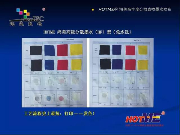 现在鸿盛数码推出的有四款分散墨水:分别是热转印墨水,高日晒热转印 / 分散直喷墨水,高温分散直喷墨水,HF 型(免水洗)分散直喷墨水。适合在涤纶、可染涤纶、丙纶上的数码印花。下面重点